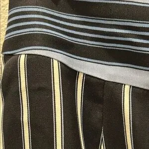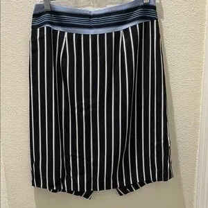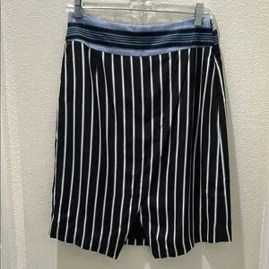 Elegant skirt featuring black and white stripes with a blue waistband. Ideal for versatile styling. Approximately 15 in at the waist and 22 in long. Is fully lined inside.