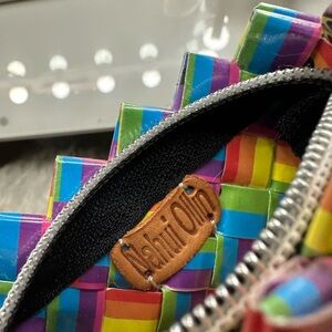 Crafted from upcycled materials for a unique and eco-friendly appeal. Its structured design and playful pattern make it a standout accessory for any occasion.