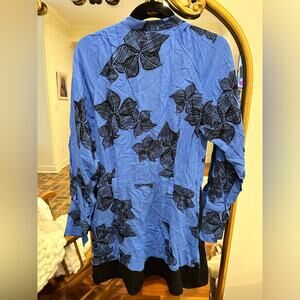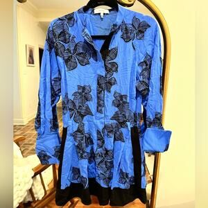 THE BLUE VIVIYAN DRESS IS CRAFTED TO A FLIPPY SILHOUETTE - A FLUID, FEMININE SHAPE. IT'S FITTED WITH A GRANDAD COLLAR AND A BUTTONED PLACKET, PATTERNED IN A LARGE FLORAL PRINT. WEAR IT WITH HEELS TO YOUR NEXT EVENT. GRANDAD COLLAR. BUTTONED PLACKET. LONG SLEEVES. FLUID SKIRT. MINI LENGTH.