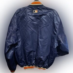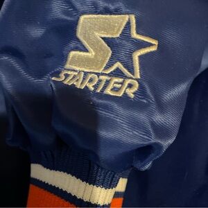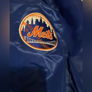 Stylish blue jacket with Mets logo. Features orange and white accents. Made by Starter.