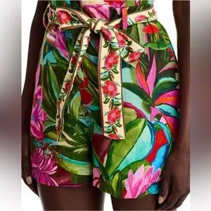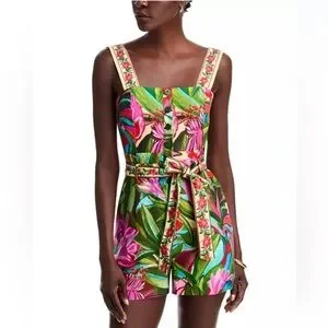 Vibrant tropical floral print romper with a belted waist. Features a colorful design perfect for summer.