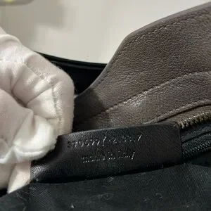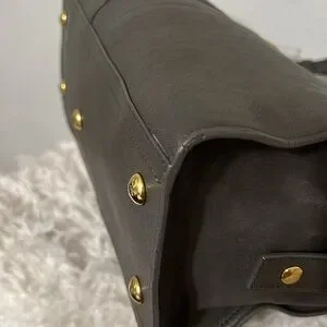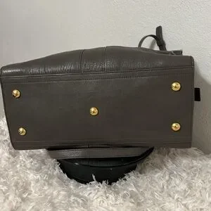 This elegant gray leather handbag is perfect for any occasion. Its sleek design and high-quality material make it a must-have accessory. The bright gold hardware stands out.