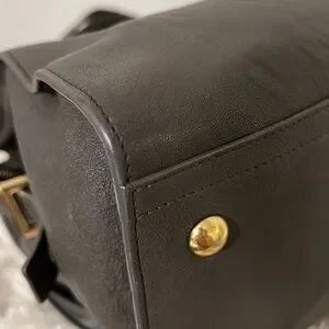 She is in great condition. Faint corner rubbings, interior in very good condition with only a few light spots. Hardware is in good condition. Zipper works well, side snaps are snappy and handles in good condition as well. The main call out is a stained area on the back center of bag. It has been cleaned and sealed and is very faint. Photo shows this well. Crossbody strap is in good condition and can be removed.