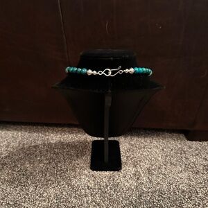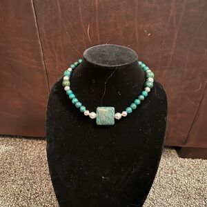 Hand Crafted “One of a Kind” by Unique Earth Chrysocolla &!Sterling Silver Necklace. It has Habdmade Native American Sterling Silver Beads (Navajo Pearls or Bench Beads) & Cladp. It is approximately 17.5”. The stones come from a mine closed for over 75 years, my miner friend, father & grandfather mined them.