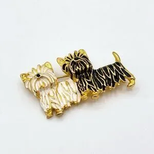 Vintage Gold Tone Yorkshire Terrier Scottie Black White Two Dogs Pin Brooch
