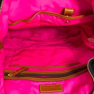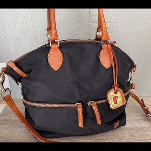 Dooney & Bourke Nylon Large Pocket Satchel Bag Black Shoulder Tan Leather Trim