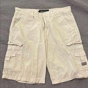 These cream and tan cargo shorts offer a relaxed fit and are crafted from a sturdy material, making them perfect for casual outings. The knee-length design ensures comfort and style, while the matching fabric belt adds a touch of coordination.