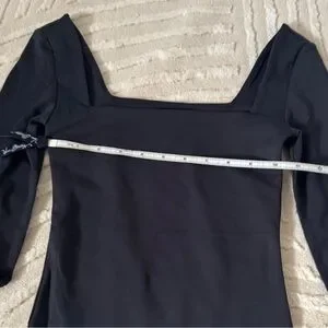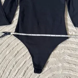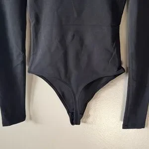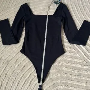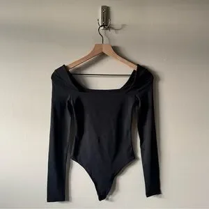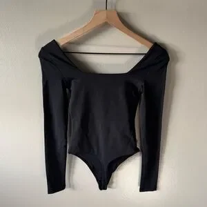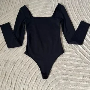 BABATON by Aritzia Bodysuit- size 2XS, but fits like a traditional XS as the fabric is super stretchy. Double lined for a smooth fit. Brand new without tags and never worn. Black in color. Square neckline. Long sleeve. Snap crotch with a thong back. Measurements are in the photos.