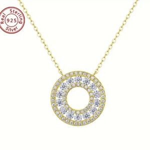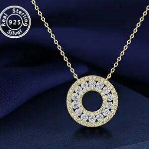 This stunning gold pendant necklace features a dazzling circular design, perfect for adding a touch of elegance to any outfit. This necklace is made from Moissanite stones and comes on a sterling silver chain. Reasonable offers are welcome.