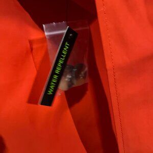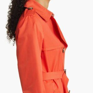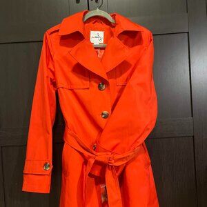 Sam Edelman. Size Lg. Mid-length Waterproof Trench. Poppy Orange. Tortoise buttons. Belted. Shell exterior is cotton & polyester. Lining is polyester.