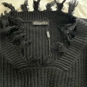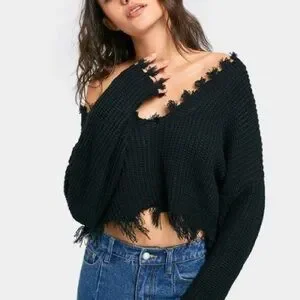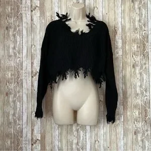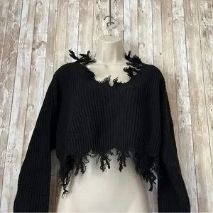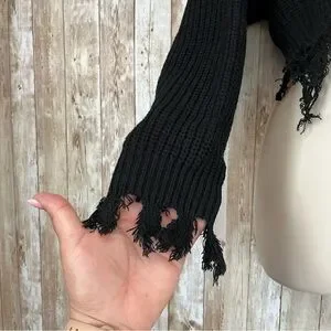Stay stylish and cozy with this black frayed knit sweater. Perfect for any casual outing.