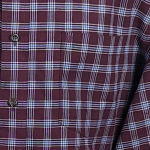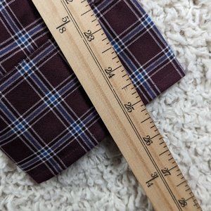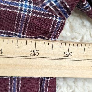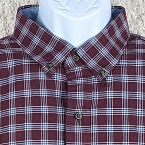 Pre-Owned Condition! 55% Cotton/45% Polyester. Handsome Burgundy, White & Blue Plaid Button Down Shirt with a Button Down Collar.