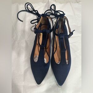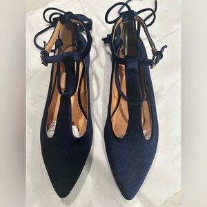 Navy blue velour Urban-80 flats/ ballet style shoes with ankle wrap. • Lace-up leg, pointed toe Secure ankle buckle strap . Can be worn without the straps. Your choice!! 💞New without Box💞