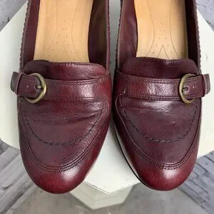 Step out in timeless style and comfort with these Naturalizer N5 Comfort mid block heel loafers. Crafted in a rich burgundy hue, these loafers embody a classic yet versatile aesthetic, perfect for an array of occasions from business meetings to casual outings. The sleek leather upper pairs effortlessly with the round toe design, ensuring a polished look for any setting. The loafers feature a practical slip-on style for ease of wear, complemented by a tasteful buckle accent for a touch of sophistication. With a heel height that strikes the perfect balance between elegance and comfort, these shoes are designed to support your day with ease. Whether it's a day at the office or a casual evening out, these Naturalizer heels are a smart addition to your wardrobe.
