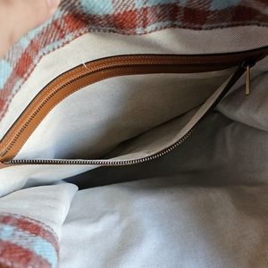 Tweed with leather straps and accents. Decorates with unique patches and crochet flowers perfect for Fall and leading into Winter.