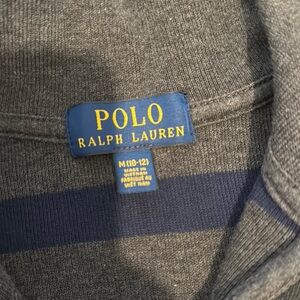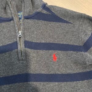 Stylish gray and navy striped pullover with a quarter zip. Features the iconic Ralph Lauren logo. Excellent condition.