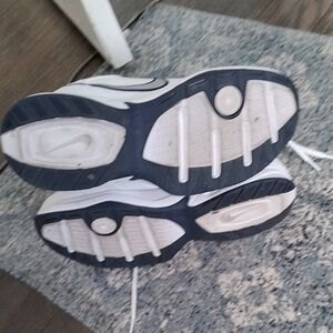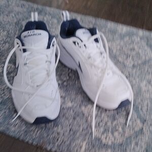 Nike Air Monarch IV sneakers in white with navy accents.