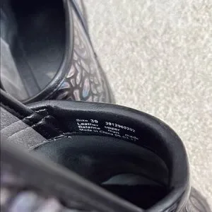 Stylish clogs with a floral pattern. Features a mix of black and iridescent colors.