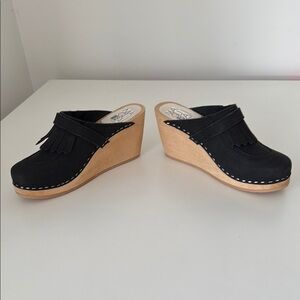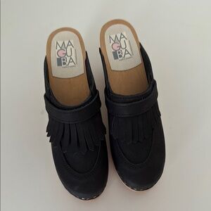 Brand new, never been worn stylish black clogs with fringe detail and wooden wedge heel. Perfect for casual wear. Brand Maguba of Sweden. The style is called Chicago and they are a size 38.