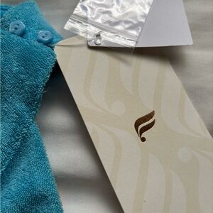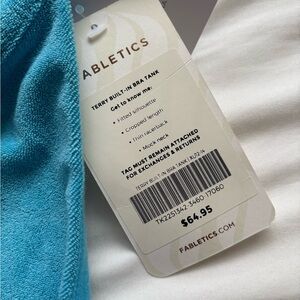 NWT Fabletics tank top with a unique terry cloth design. Features crop fit, built-in bra, t-back or racerback, cute button closure, beautiful aqua blue. Perfect for casual outings with jeans, shorts, leggings. Measures ptp 19 and stretches, length is 19. Size XL