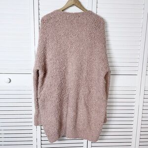 Free People oversized cardigan in a blush pink alpaca-blend boucle knit. Grandpa style cardigan with large snap closure and patch pockets. This sweater is well-loved with some pilling that’s not very noticeable because of the boucle yarn texture. Size XS, but this is very oversized and can easily fit small and medium as well.