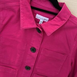 Vibrant pink blazer with button closure. Features front pockets. Stylish and versatile.