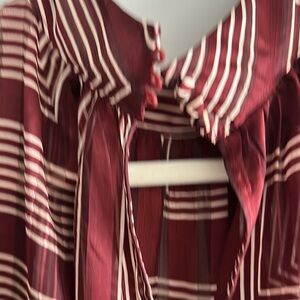 Stylish blouse with a geometric pattern. Features burgundy and white colors. Perfect for any occasion. Measurements length 27 inches, armpit to armpit 24 1/2 inches, sleeve 26 inches. Button up collar in back. Material 100% polyester.