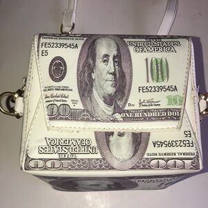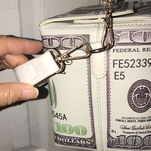 Brand new crossbody bag has a money print design. Bag itself is a box shape. Features an adjustable white strap and gold chain accents. You can also detach the hand strap if desired (pic7). Top flap opens/closes with magnetic studs. Brown cloth interior with one side pocket. Measures about 6.5”L x 6.5” W. Unique & stylish!