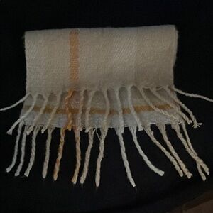 Soft plaid scarf with fringe. Features cream and orange tones. Perfect for layering.