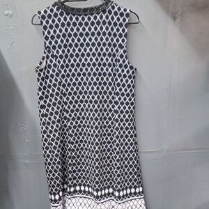 This chic midi dress features a sleeveless design with a V-neckline, perfect for casual or work settings. The blue and white geometric pattern adds a modern touch to the classic sheath silhouette, making it a versatile addition to any wardrobe.
