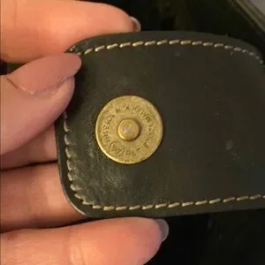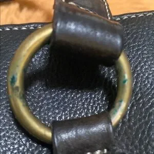 Fossil Stylish black leather handbag with dual handles and a decorative key charm. Perfect for any occasion. Brass hardware needs cleaned, two zippered pockets on the inside a snap to close and two open areas with a side pocket, super adorable a few small spots as shown in pictures.
