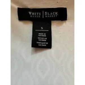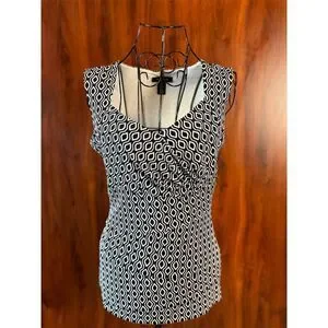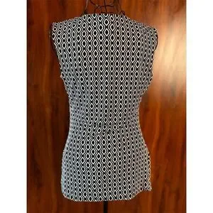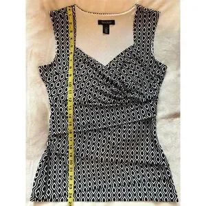 Keywords: White House Black Market, sleeveless blouse, women's top, geometric pattern, sweetheart neckline, faux wrap, tiered jersey, casual wear, spring fashion, black blouse, size S, polyester blend, versatile top, pre-owned blouse, elegant casual.