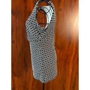 The White House Black Market Women's Sleeveless Blouse in size S is your go-to for effortless style and comfort. With its chic geometric pattern and flattering sweetheart neckline, this blouse is perfect for casual outings, brunch dates, or a day at the office. The faux wrap design and tiered jersey fabric add a touch of elegance, while the blend of polyester and spandex ensures a comfortable fit. Ideal for spring, this versatile black blouse pairs beautifully with jeans or skirts. Pre-owned, in excellent condition.