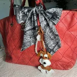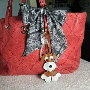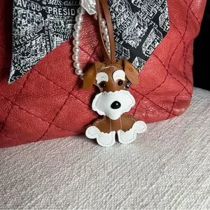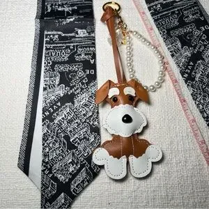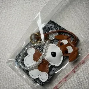 Includes faux leather dog bag charm and a pearl bag charm.