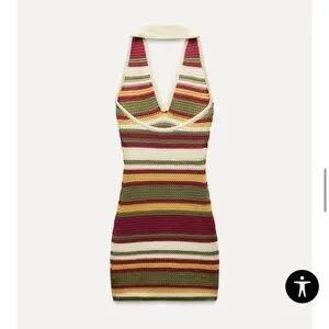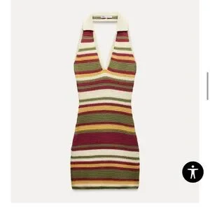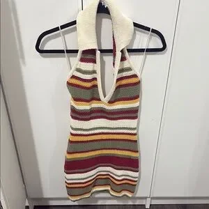 This stylish halter knit top features a vibrant striped pattern. Perfect for adding a pop of color to your wardrobe.