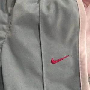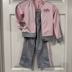 Stylish Nike kids matching set. Pink jacket with gray accents. Comfortable gray pants with pink stripes.