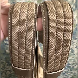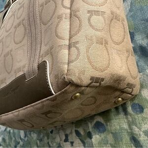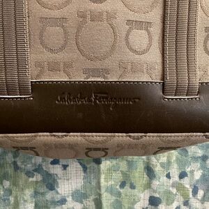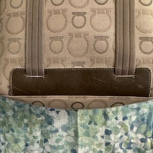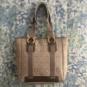 Authentic pre loved Salvatore Ferragamo Gancini Canvas Tote in cream/beige/brown neutral tones with an olive/army green interior featuring 2 side pockets and one large zipper pocket. Normal signs of wear shown in photos including scuffing/scratching on leather and wear on exterior bottom corners. Please check photo’s thoroughly for any signs of damage to the condition of the bag