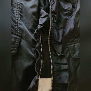 Stylish black ruffled jacket perfect for any occasion. Features a unique design with button details. Ideal for adding a touch of elegance to your wardrobe.