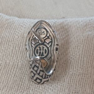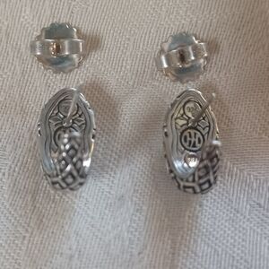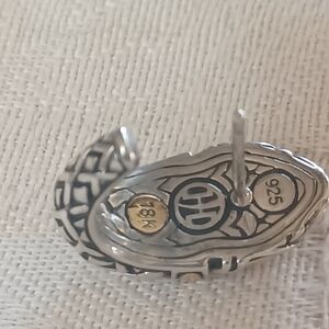 Lovely John Hardy Legends Naga Shrimp Earrings in Sterling Silver and 18k Yellow gold. Naga is one of the JH classic designs that uses Dragon Scales. These earrings have Naga details in Sterling Silver and 18k along with 18k dots. These are a shrimp earring or a J hoop that has a post and butterfly back. They are about 1/4 inch wide and about 3/4 inches long. The backs have the JH makers mark, 18k, and 925. The butterfly backs are also stamped 925. These are a fabulous pair of earrings to wear every day.