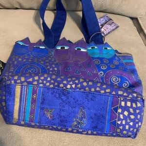 Stylish and artistic, this Laurel Burch bag features her signature cat design in vibrant blue and purple. Perfect for adding a unique touch to any outfit.
