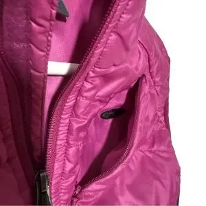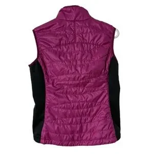 Stylish REI puffer vest in pink and black. Perfect for layering. There are two noticeable flaws, please see pics. The function of the vest is not impacted. The black fleece side panels add shape, warmth, and stretch. A pocket at the upper left chest has a pass through for earphones or a power cable for your electronics. Packs down small for travel or camping. Good used condition. Approximate measurements: pit to pit 19”, length 24” from collar hem to bottom hem.
