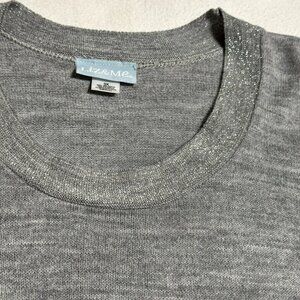 This lightweight knit sweater by Liz & Me offers a relaxed fit with a touch of shimmer, ideal for an elegant yet comfortable wardrobe addition. The neckline has silver metallic threads woven through it.