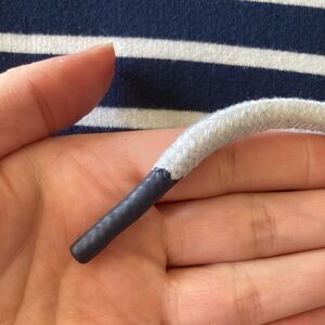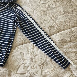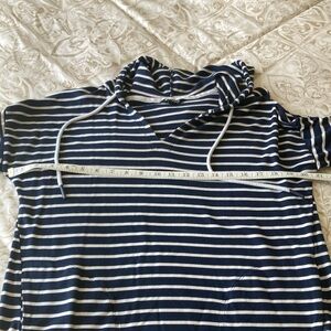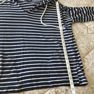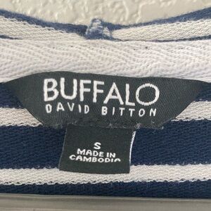 Navy and white striped hoodie by Buffalo David Bitton. Features a drawstring hood for comfort and v neck cut. Strings have a wax type blue sealed tip to prevent fraying. Features two pockets (not kangaroo). This is not a warm hoodie, t-shirt material.