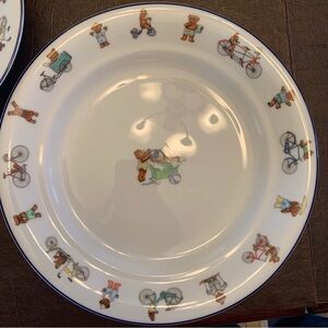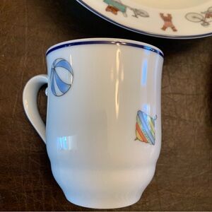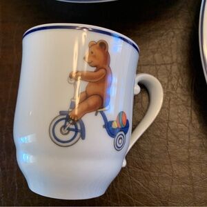 Adorable dinnerware set featuring playful bear illustrations. Includes a plate, bowl, and mug. Perfect for children's meals.