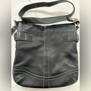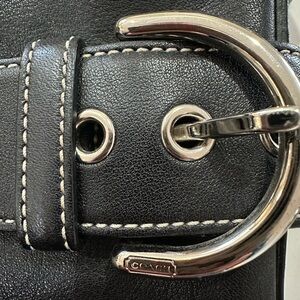 Elegant black leather shoulder bag with stylish buckle accents. Perfect for any occasion, can double strap over for shoulder use as well as crossbody, excellent condition