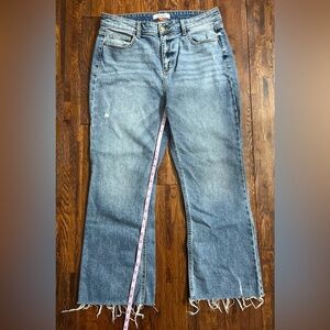- ARULA High Rise Kick Flare Cropped Jean with Raw Hem in Medium Wash Size 10