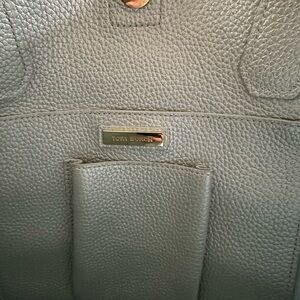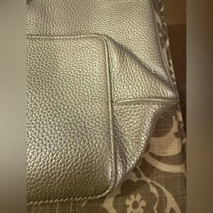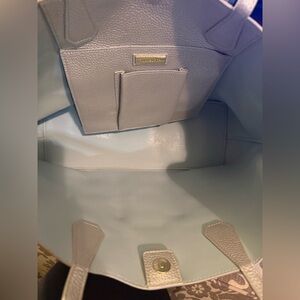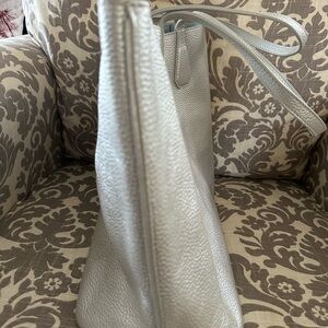 Elegant silver tote bag pale blue interior perfect for any occasion. Features a sleek design with ample space for essentials. 37cm wide 28cm tall.