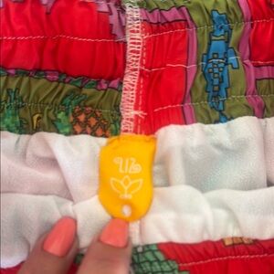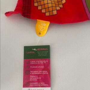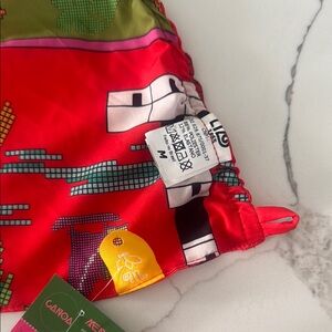Vibrant two-piece set with tropical print. Features a red and green color scheme with playful patterns.