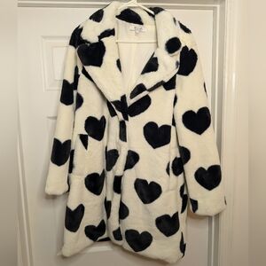 Stoosh by 26 International New York & Co. faux fur coat with black heart patterns on a cream background. Perfect for a chic and cozy look. Excellent condition. I wore this once for a destination wedding.