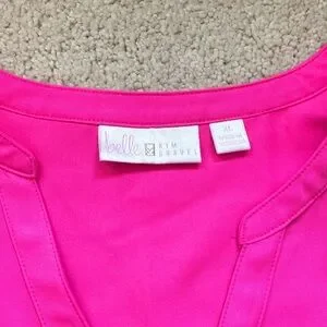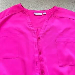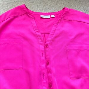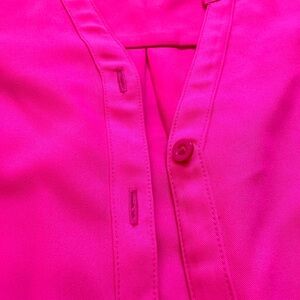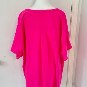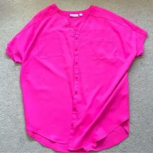 Short sleeve blouse from belle by Kim gravel size XL, vibrant hot pink color great for summer, button up front, very versatile could be worn as a top or swim cover up, made in Indonesia, brand new without tags